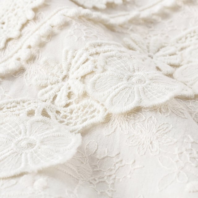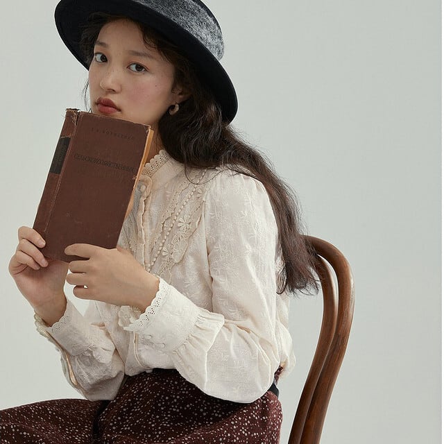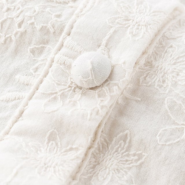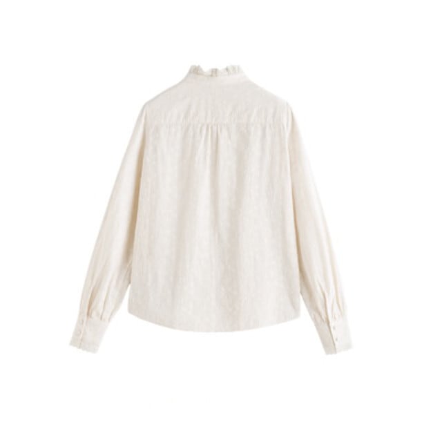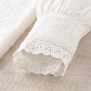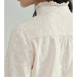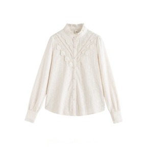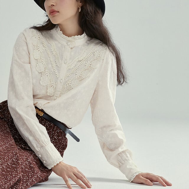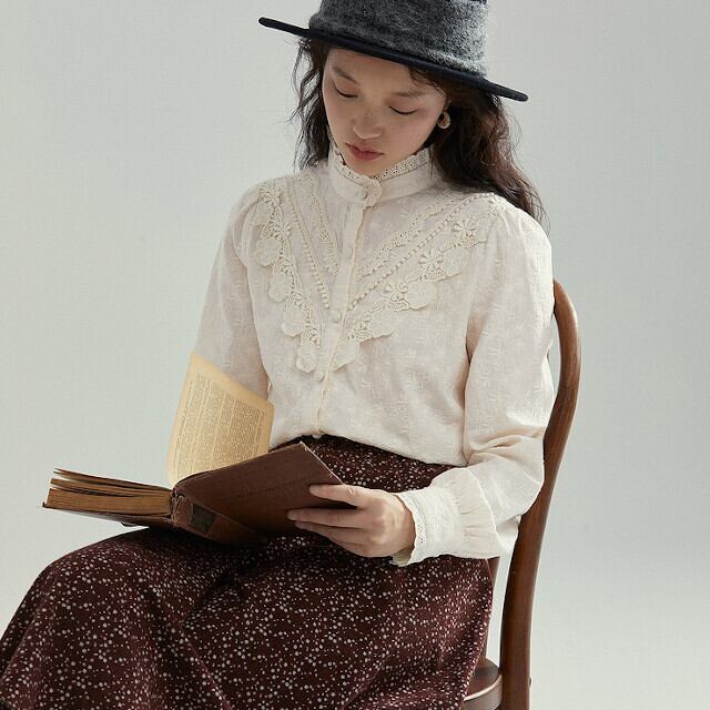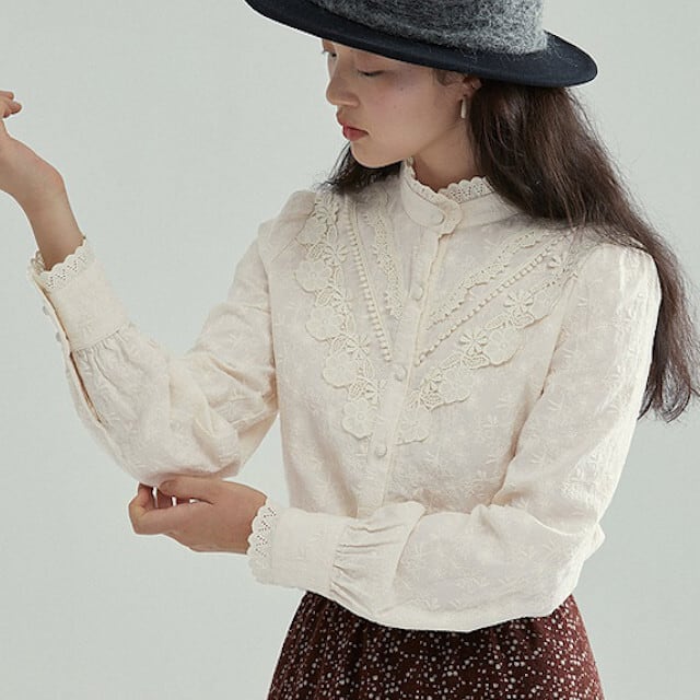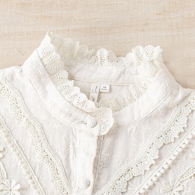 ブラウス レディース トップス コットンブラウス フェミニン 長袖 詰襟 立襟 レース かわいい おしゃれ オフホワイト アプリコット S/M/L/XL