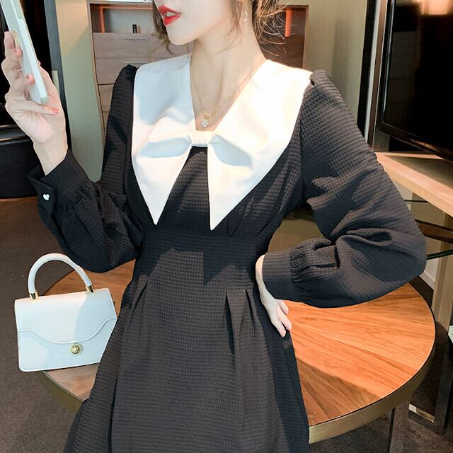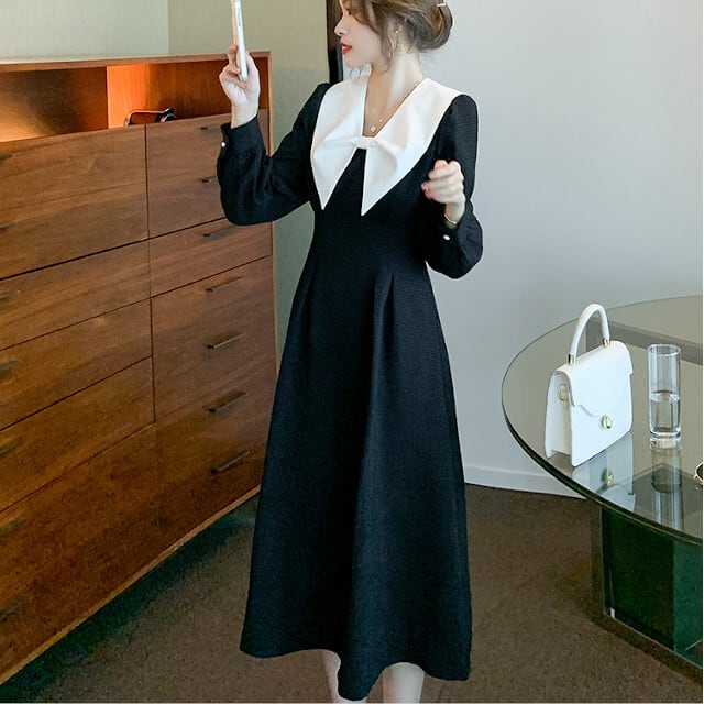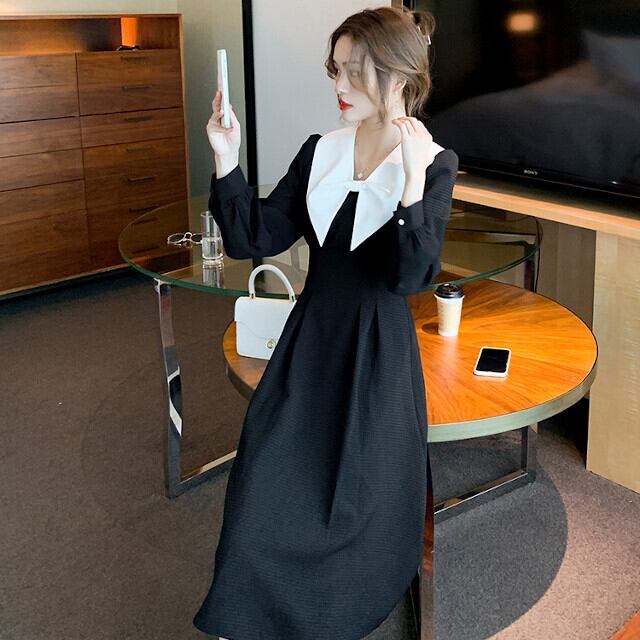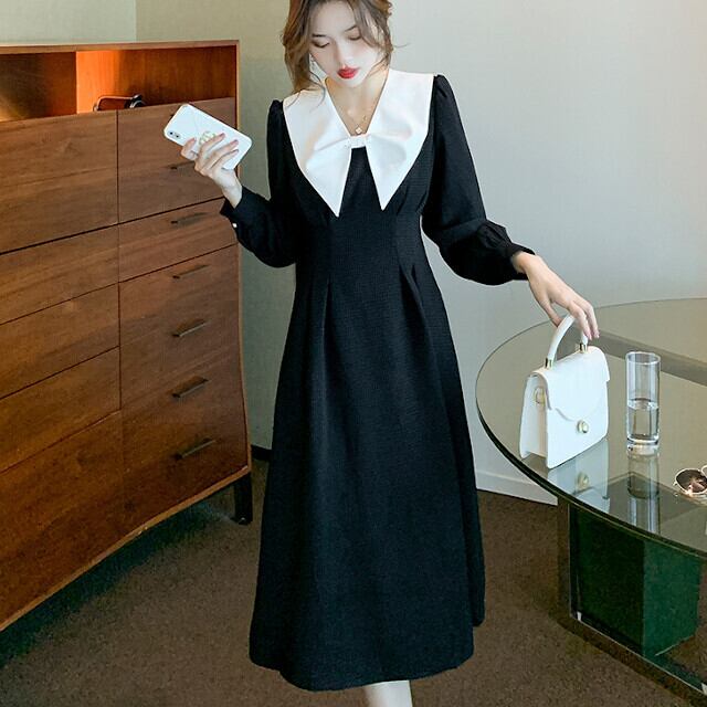 ワンピース レディース ロングワンピ ミモレ丈 長袖 オケージョンワンピ おしゃれ おめかし お出かけ デート お呼ばれ ビッグカラー 襟付き ブラック S/M/L/XL