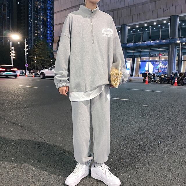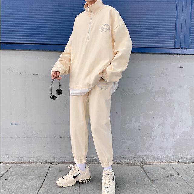 【予約販売】メンズ セットアップ 上下 長袖 ジップアップ ハイネック ブラック グレー オフホワイト 男前 スエット 韓国 パンツ セット パーティ カジュアル 部屋着 リラックス ルームウエア 韓国 トレンド 大きいサイズ M/L/XL/2XL