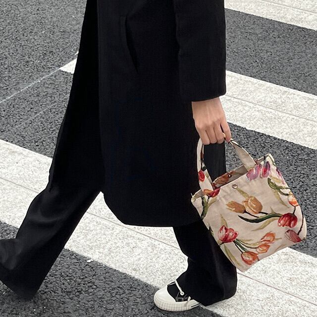 トートバッグ 手提げ レディース ジャガード 高級感 チューリップ 花柄 フラワー ビンテージ風 レトロ アンティーク風 ブラック/ベージュ