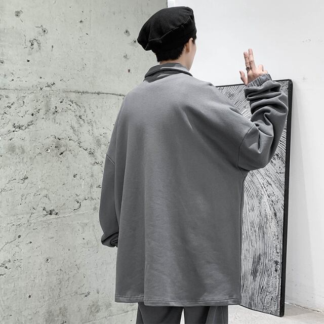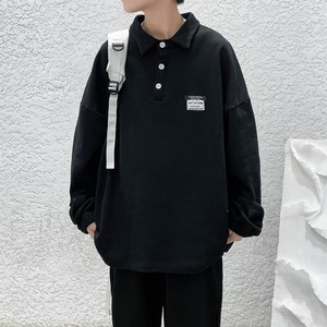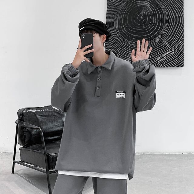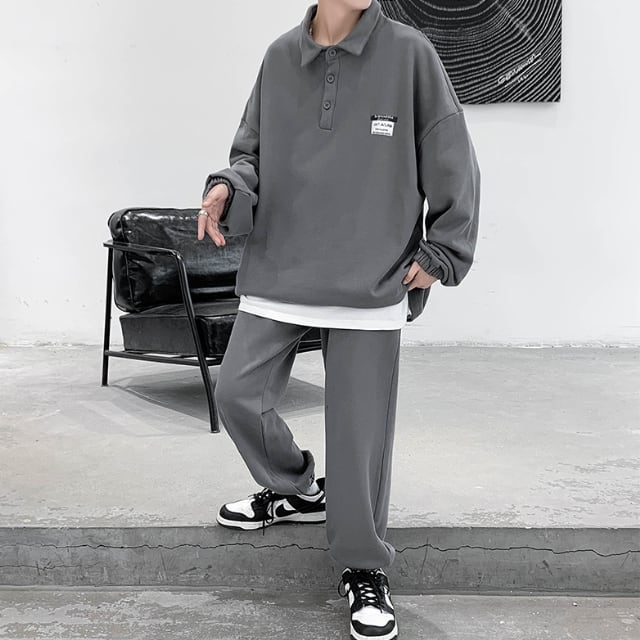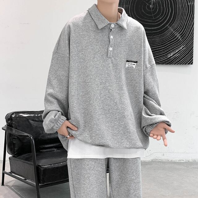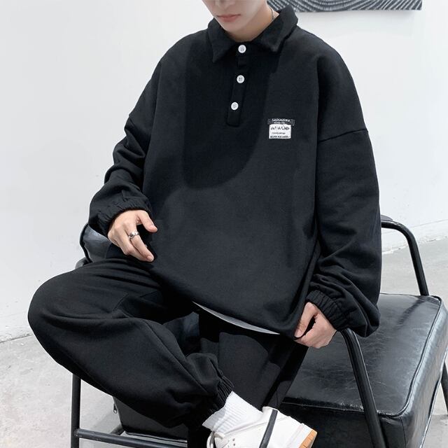 【予約販売】メンズ セットアップ 上下 長袖ポロシャツ タグデザイン ブラック グレー 男前 スエット 韓国 パンツ セット ウエストゴム カジュアル 部屋着 リラックス ルームウエア 韓国 トレンド 大きいサイズ M/L/XL/2XL/3XL/4XL/5XL