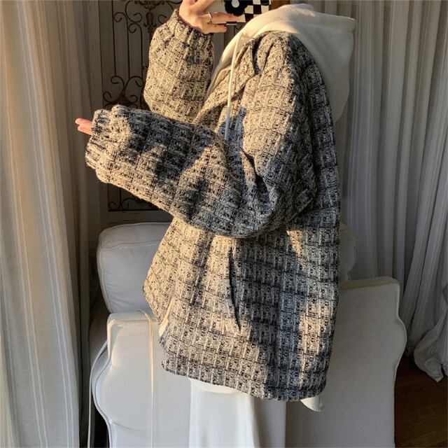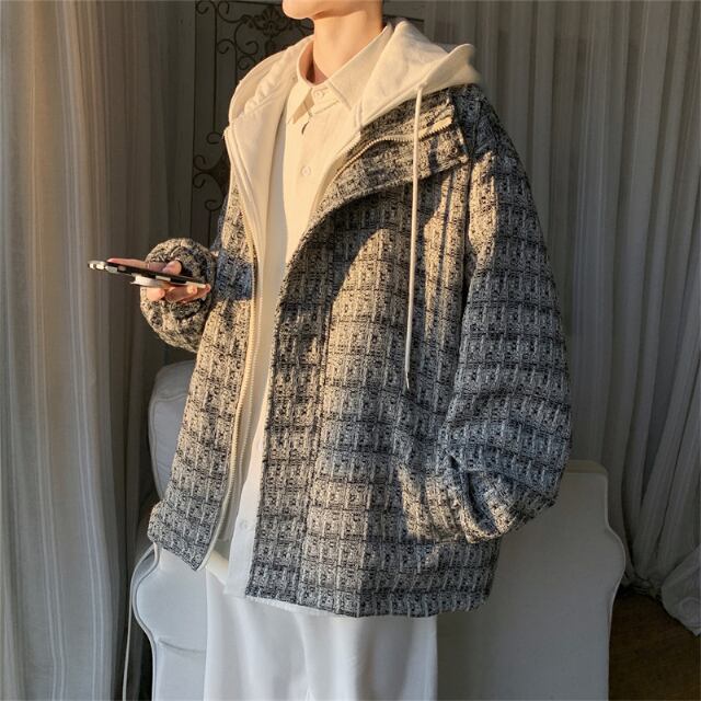 【予約販売】重ね着風 アウター パーカー フード付き チェック柄 ショート丈 グレー ベージュ ブルー 防寒 お洒落 カジュアル 秋冬 大きいサイズ M/L/XL/2XL