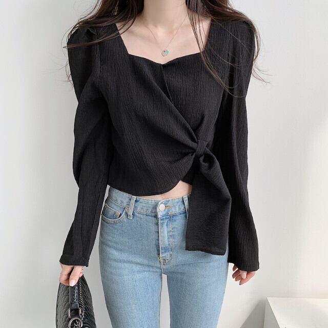 ブラウス レディース トップス 立体感 長袖 くしゅくしゅ 不規則 アシンメトリー ドレープ おしゃれ ブラック/ブラウン/ホワイト S/M