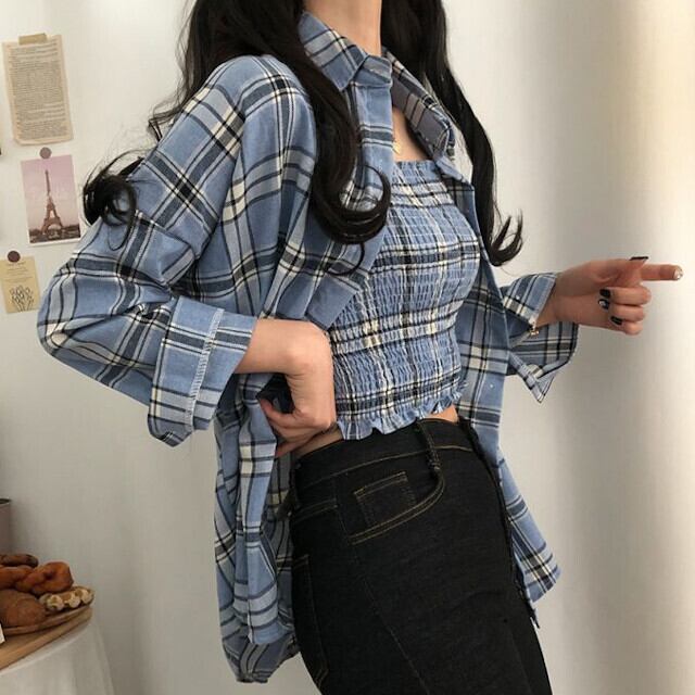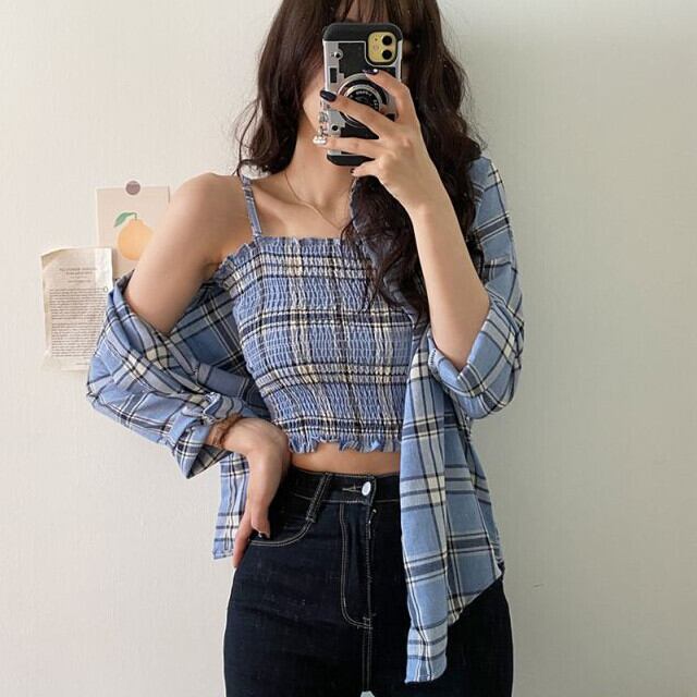 セットアップ シャツ キャミソール 2点セット 長袖 ショート丈 ルーズフィット チェック柄 セクシー カジュアル 大人かわいい ツーピース レディース ブルー/ホワイト