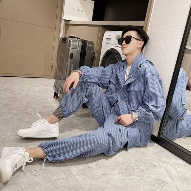 【予約販売】メンズ セットアップ 上下 ブルー グレー ストライプ柄 フード付き ダンス 部屋着 長袖 防寒 ジム スポーツウエア カジュアル 秋冬 大きいサイズ M/L/XL/2XL/3XL