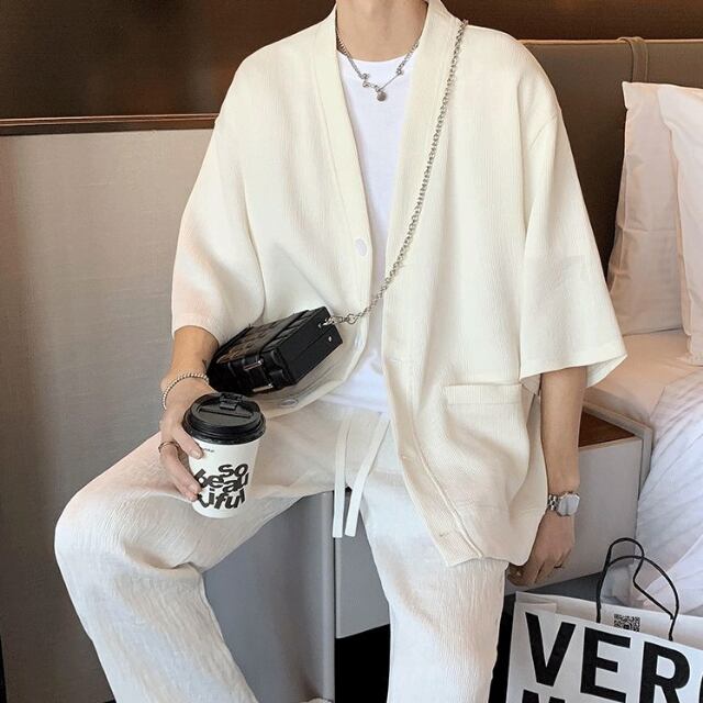 【予約販売】メンズ セットアップ 無地 カーディガン 半袖 ゆったり グリーン ブラック ホワイト カジュアル モード きれいめ 男前 ツーピース モード こなれ感 パンツ セット 韓国 トレンド 大きいサイズ M/L/XL/2XL