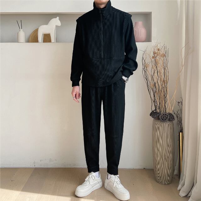 【予約販売】メンズ セットアップ 無地 ハイネック ブラック ホワイト スエット スリム カジュアル モード きれいめ 男前 パンツ セット ジャージ ジム スポーティー ダンス ジム 韓国 トレンド 大きいサイズ S/M/L/XL