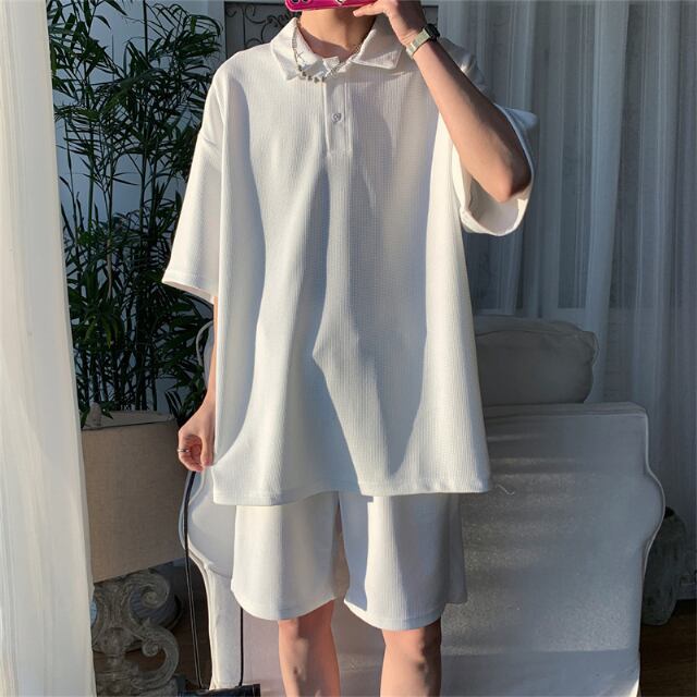 【予約販売】メンズ セットアップ 上下 半袖 ハーフパンツ ストリート ポロシャツ ブラック ホワイト オレンジ 部屋着 韓国 ジム スポーツウエア カジュアル 春 夏 大きいサイズ M/L/XL/2XL/3XL