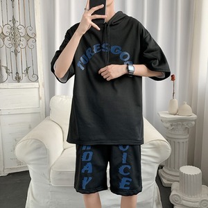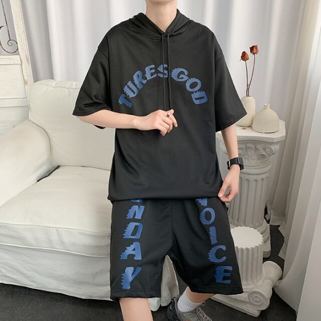 【予約販売】メンズ セットアップ 上下 フーディー ロゴ 半袖 ハーフパンツ ストリート パーカー ブラック ホワイト 部屋着 韓国 ジム スポーツウエア カジュアル 春 夏 大きいサイズ M/L/XL/2XL
