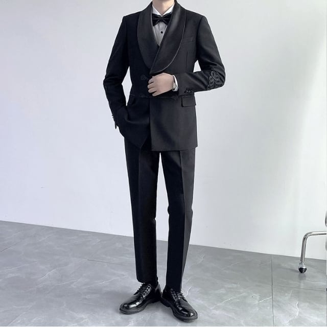 【予約販売】メンズ セットアップ 3点セット スーツ ベスト 刺繍 チャイナ オールブラック シック スリム 男前 ブラック 黒 シングル フォーマル ウエディング ジャケット パンツ セット クラシック レトロ パーティ 二次会 同窓会 結婚式 韓国 トレンド 大きいサイズ M/L/XL/2XL/3XL