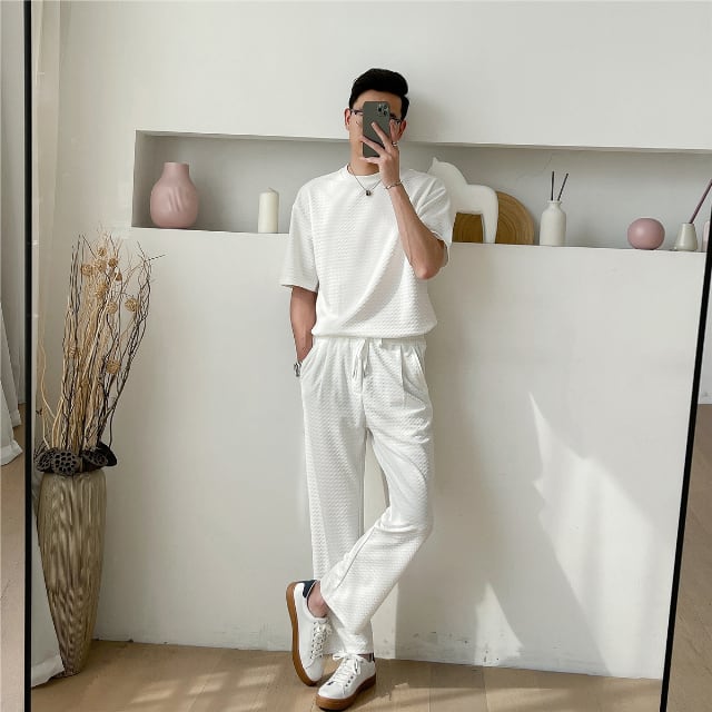 【予約販売】メンズ セットアップ 上下 半袖 ストレート パンツ ストリート Tシャツ ブラック ホワイト グリーン 部屋着 韓国 ジム スポーツウエア カジュアル 春 夏 大きいサイズ M/L/XL/2XL
