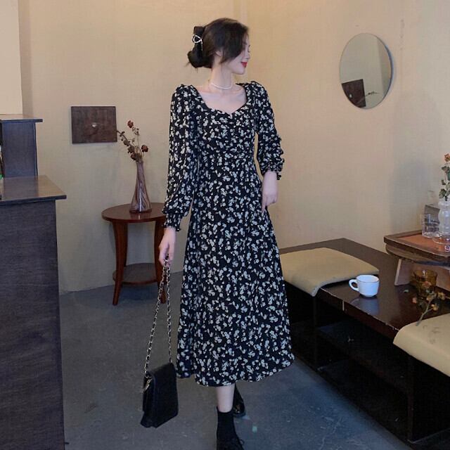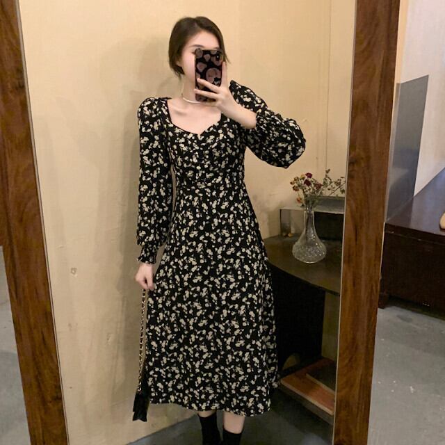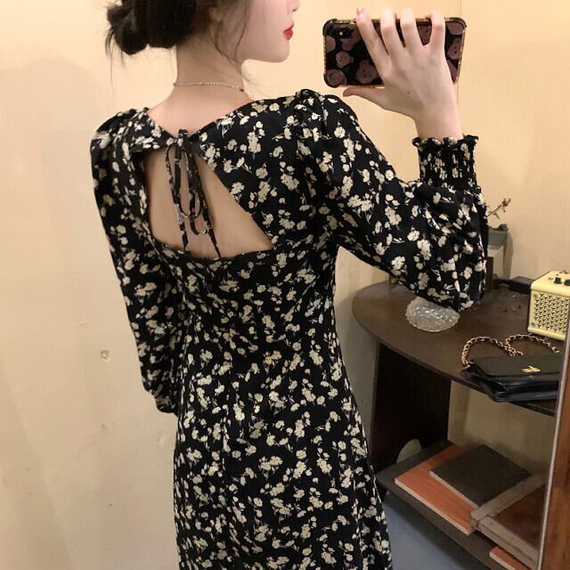 ワンピース レディース ワンピースドレス ロングワンピ ロング丈 ロングスリーブ 花柄 パフスリーブ 長袖 背中開き ブラック M/L/XL/2XL/3XL/4XL