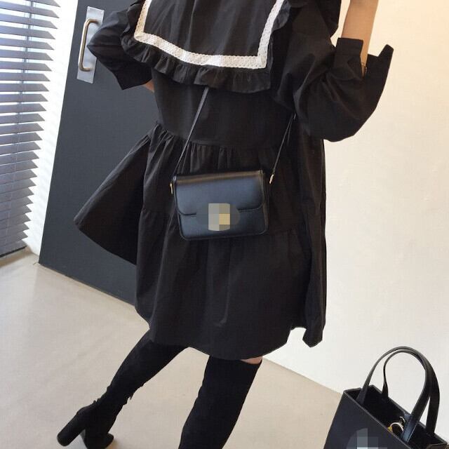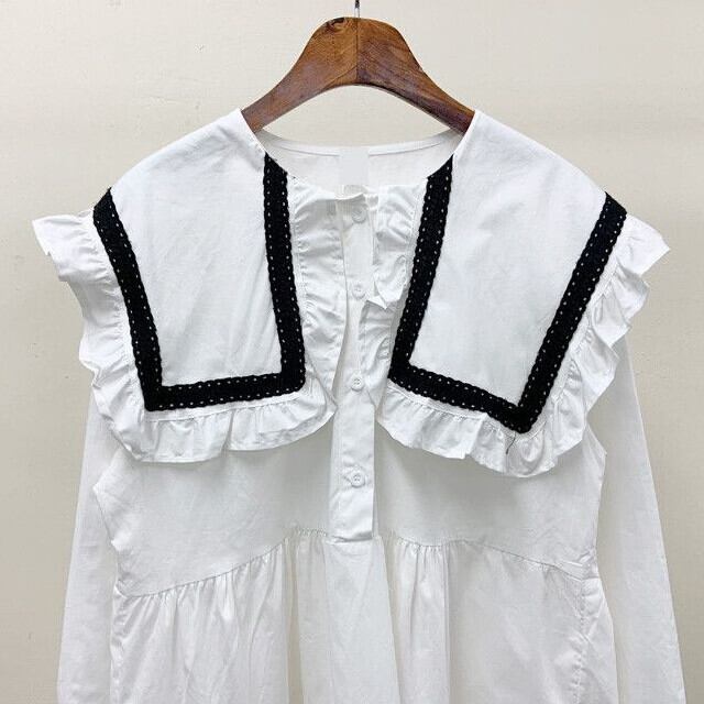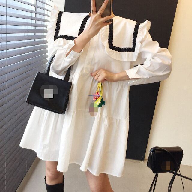 ワンピース レディース ミニ丈 襟付き ティアード フレア ロングスリーブ 長袖 ビッグカラー 刺繍 ミニワンピ おしゃれ ホワイト/ブラック