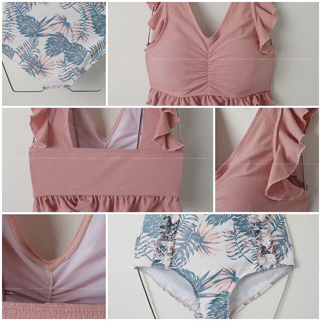 【予約販売】水着 カップル水着 3点セット ペアルック メンズ レディース 体型カバー フリル ボタニカル柄 ピンク パレオ 総柄 海水パンツ ペア水着 恋人 おそろい お揃い M/L/XL