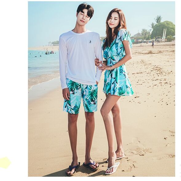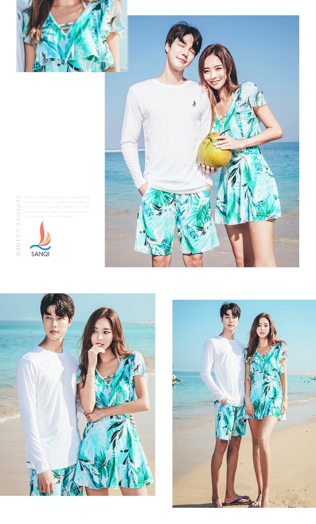 【予約販売】水着 カップル水着 2点セット ペアルック メンズ レディース フラワー柄 花柄 グリーン ワンピース 海水パンツ ペア水着 恋人 おそろい お揃い L/XL/2XL/3XL