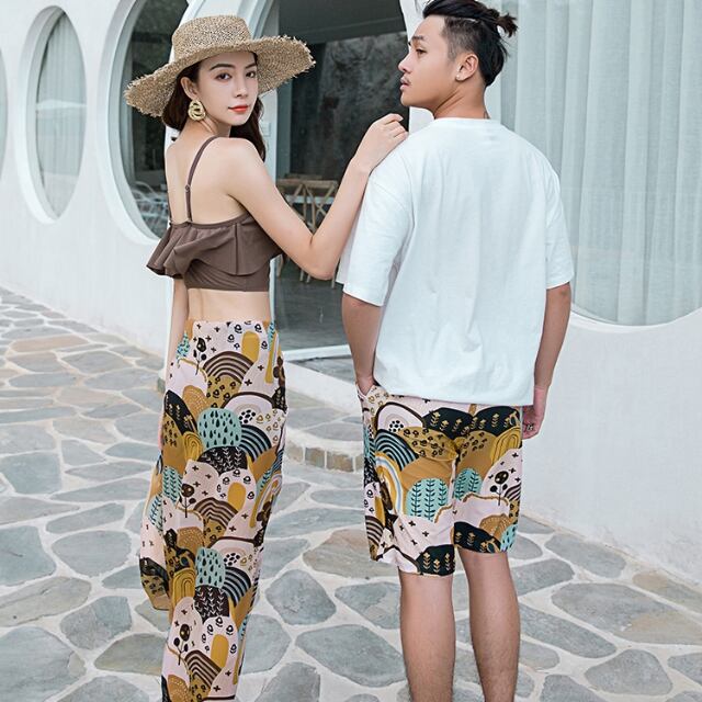 【予約販売】水着 カップル水着 3点セット ペアルック メンズ レディース 総柄 ビキニ パレオ ブラウン 海水パンツ ペア水着 恋人 おそろい お揃い M/L/XL