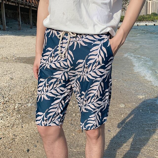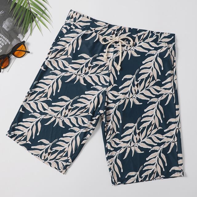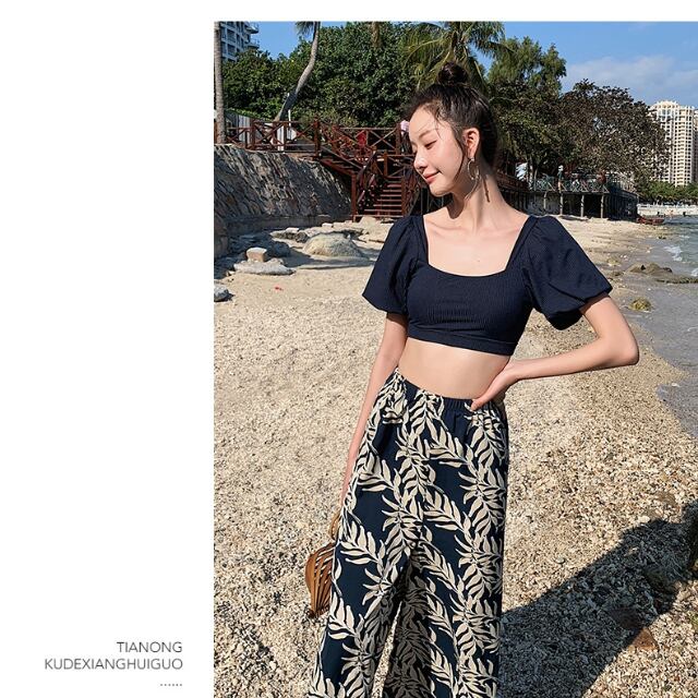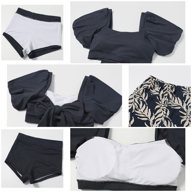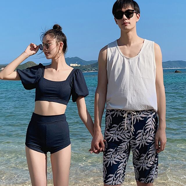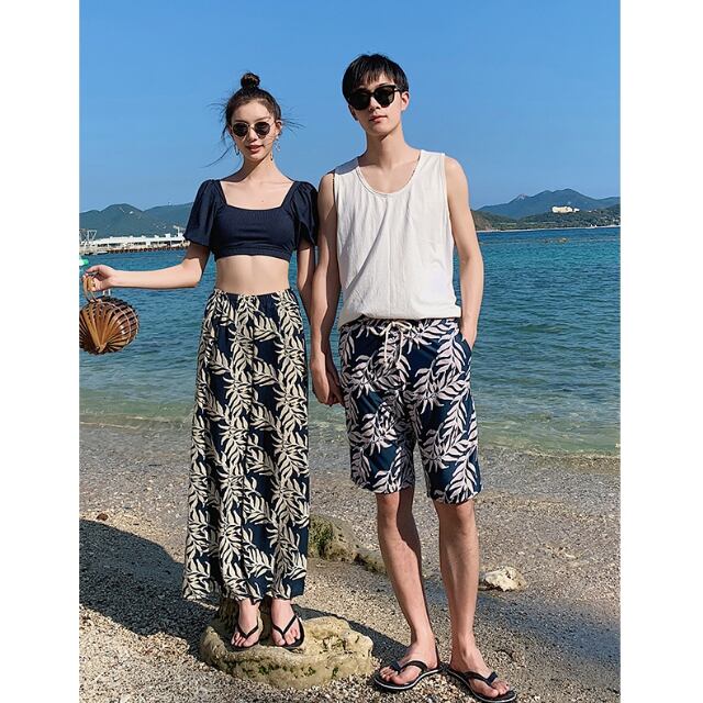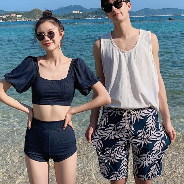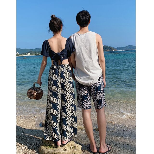 【予約販売】水着 カップル水着 3点セット ペアルック メンズ レディース リーフ柄 ビキニ ワイドパンツ ブラック 黒 海水パンツ ペア水着 恋人 おそろい お揃い M/L/XL