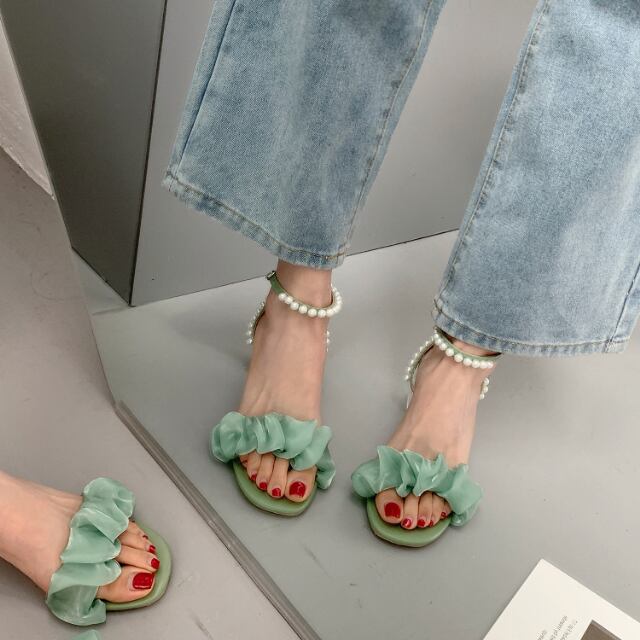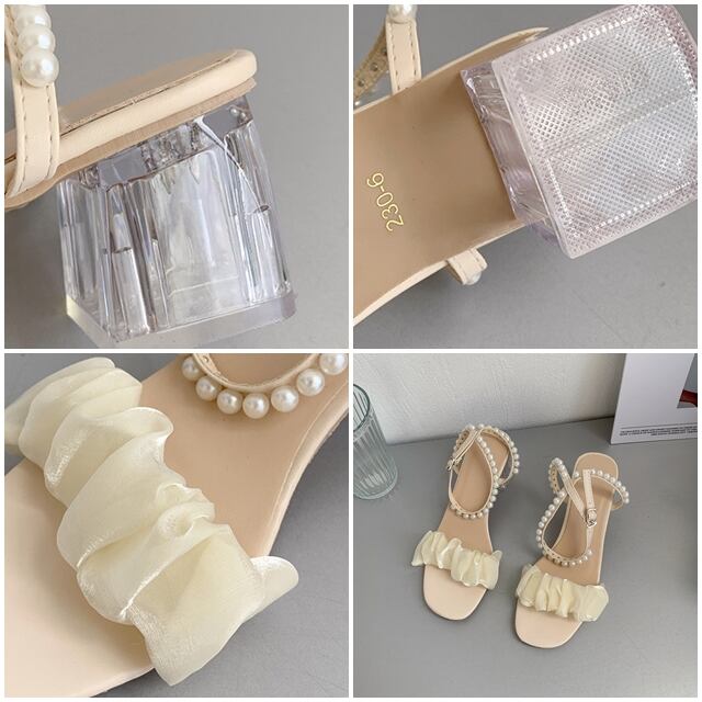 【予約販売】レディース サンダル パール シフォン 華奢 クリアヒール 透明 クリアサンダル こなれ感 大人可愛い 韓国 全3色 ブラック/グリーン/オフホワイト 22cm/22.5cm/23cm/23.5cm/24cm/24.5cm
