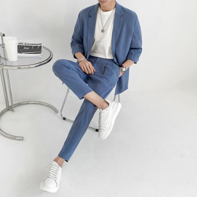 【予約販売】メンズ セットアップ スーツ 無地 シック スリム シンプル 韓国 男前 グレー/ブラック/オフホワイト/ブルー/グリーン ジャケット パンツ セット セットアップ ビジネス 通勤 フォーマル パーティ 二次会 同窓会 結婚式 韓国 トレンド 春 大きいサイズ M/L/XL/2XL/3XL