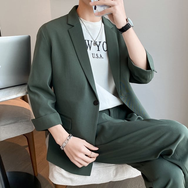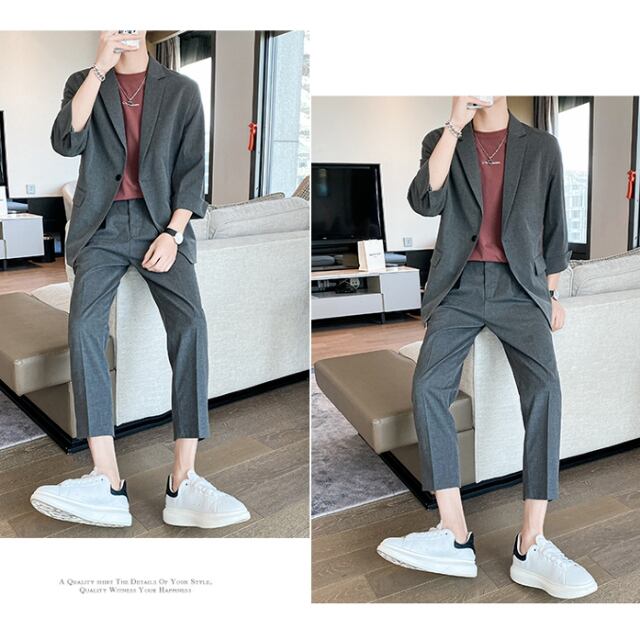 【予約販売】メンズ セットアップ スーツ 無地 七分袖 シック スリム シンプル 韓国 男前 グリーン/ブラック/グレー/クリーム/ブルー ジャケット パンツ セット セットアップ ビジネス 通勤 フォーマル パーティ 二次会 同窓会 結婚式 韓国 トレンド 春 夏 大きいサイズ M/L/XL/2XL