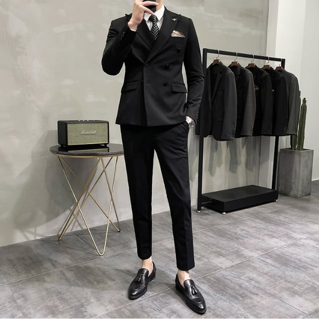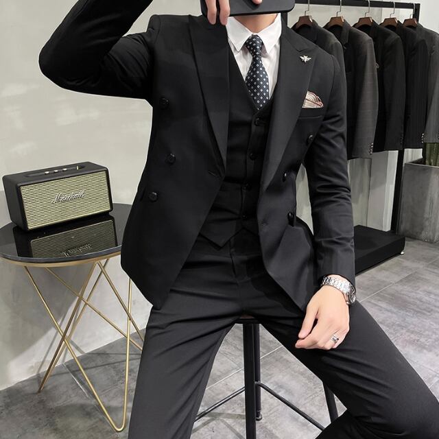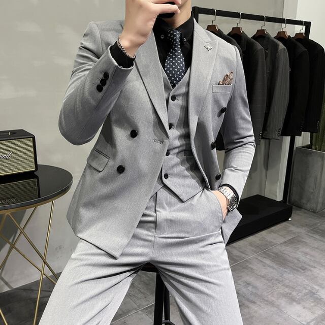 【予約販売】メンズ セットアップ スーツベスト 3ピース 無地 ダブル シック スリム シンプル 韓国 男前 ライトグレー/ダークグレー/グレー/ブラック ジャケット パンツ セット セットアップ ビジネス 通勤 フォーマル パーティ 二次会 同窓会 結婚式 韓国 こなれ感 トレンド 春 大きいサイズ S/M/L/XL/2XL/3XL/4XL/5XL/6XL/7XL