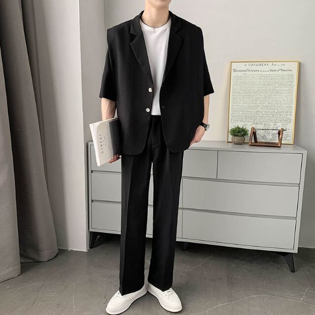 【予約販売】メンズ セットアップ スーツ 無地 七分袖 シック こなれ感 オーバーサイズ シンプル 韓国 男前 ブラック/ホワイト ジャケット パンツ セット セットアップ ビジネス 通勤 フォーマル パーティ 二次会 同窓会 結婚式 韓国 トレンド 春 大きいサイズ M/L/XL/2XL/3XL
