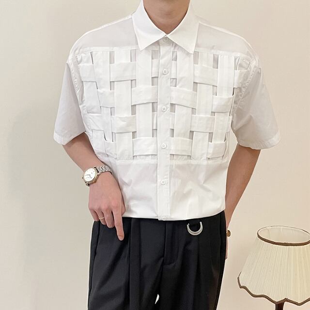 【予約販売】シャツ 半袖 メンズ グリーン ホワイト ブラック 編み込み こなれ感 カジュアル シンプル モード お洒落 韓国 トレンド 春 夏 M/L/XL