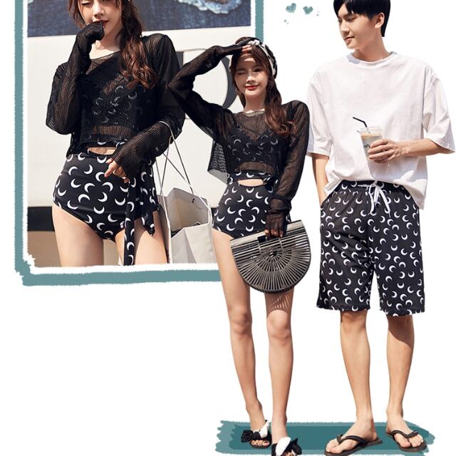 【予約販売】水着 カップル水着 3点セット ペアルック メンズ レディース ムーン柄 月柄 ブラック ワンピース 海水パンツ 海パン ペア水着 恋人 おそろい お揃い M/L/XL/2XL/3XL