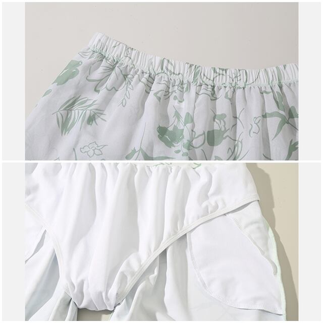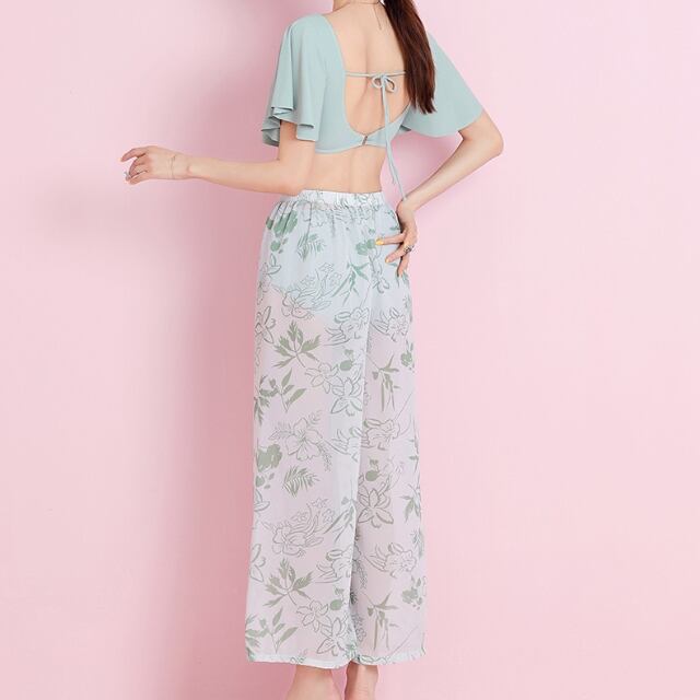 【予約販売】水着 カップル水着 3点セット ペアルック メンズ レディース フリル フラワー柄 花柄 グリーン ビキニ パンツ 海水パンツ ペア水着 恋人 おそろい お揃い M/L/XL/2XL