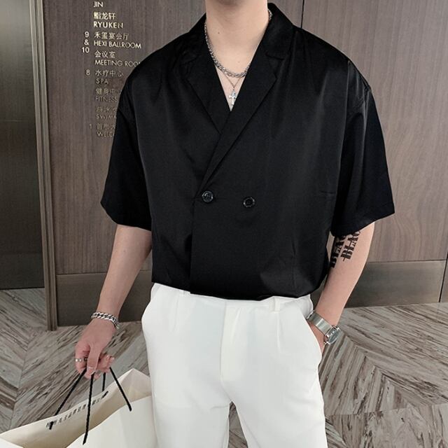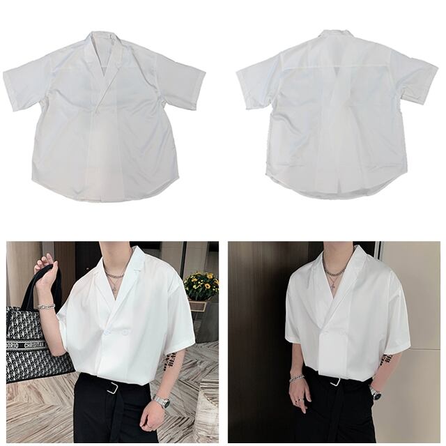 【予約販売】シャツ 半袖 メンズ ホワイト ブラック Vネック ノーカラー 開襟 無地 こなれ感 カジュアル シンプル モード お洒落 韓国 トレンド 春 夏 M/L/XL