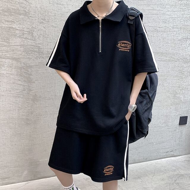 【予約販売】メンズ セットアップ スエット 無地 ライン ジップアップ 上下 ポロシャツ 半袖 ハーフパンツ ストリート ブラック/ホワイト 部屋着 韓国 ジム スポーツウエア カジュアル 春 夏 大きいサイズ M/L/XL/2XL