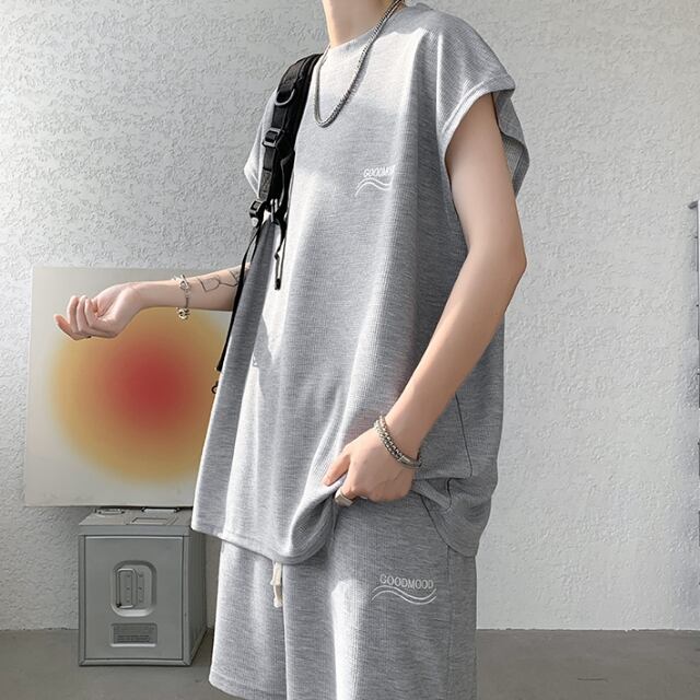 【予約販売】メンズ セットアップ スエット 無地 上下 ノースリーブ ハーフパンツ ストリート ブラック/グレー/ホワイト 部屋着 韓国 ジム スポーツウエア カジュアル 春 夏 大きいサイズ M/L/XL/2XL/3XL/4XL/5XL