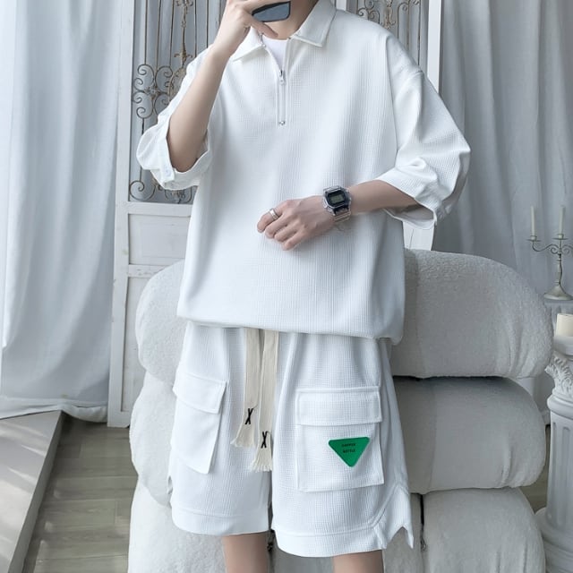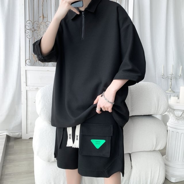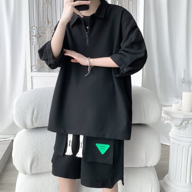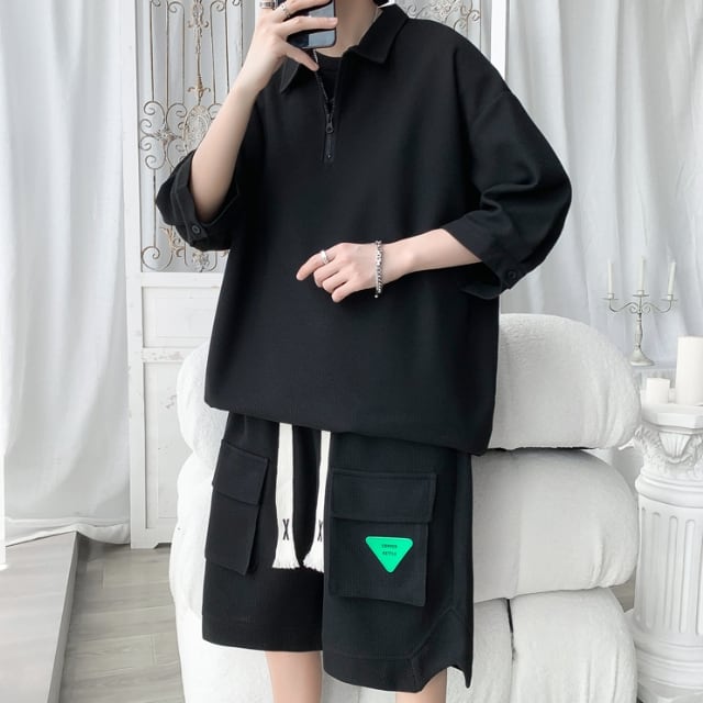 【予約販売】メンズ セットアップ スエット ポロシャツ 無地 上下 七分袖 ハーフパンツ ストリート ブラック/グレー/ホワイト/グリーン 部屋着 韓国 ジム スポーツウエア カジュアル 春 夏 大きいサイズ M/L/XL/2XL/3XL/4XL/5XL