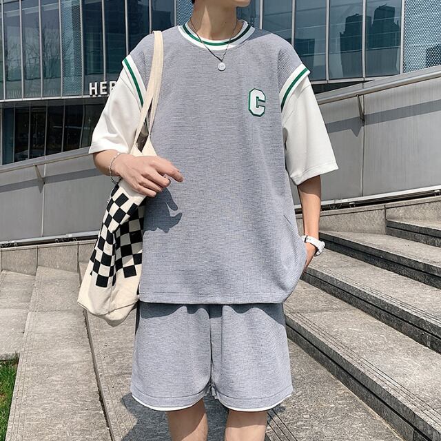 【予約販売】メンズ セットアップ スエット ワッフル 無地 上下 ノースリーブ タンクトップ ユニフォーム風 ハーフパンツ ストリート ブラック/グレー 部屋着 韓国 ジム スポーツウエア カジュアル 春 夏 大きいサイズ M/L/XL/2XL/3XL/4XL