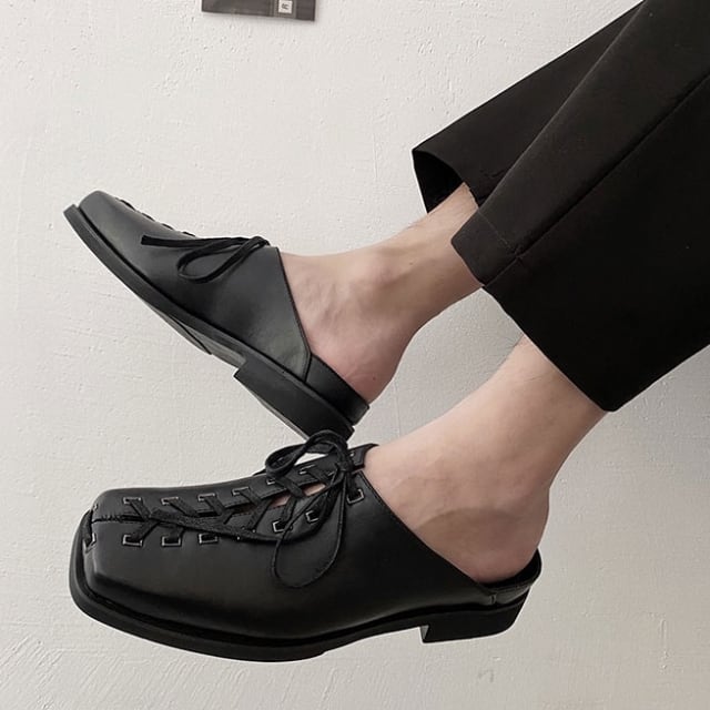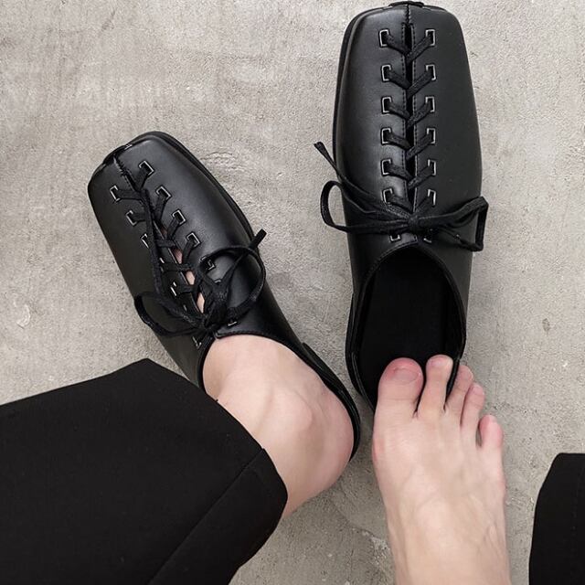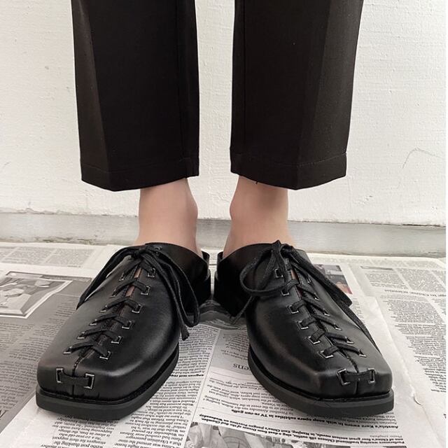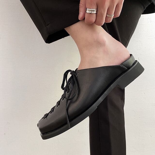 【予約販売】サンダル メンズ フラット ローファー レースアップ バブーシュ スリッポン 靴 ブラック お洒落 こなれ感 韓国ファッション 24cm/24.5cm/25cm/25.5cm/26cm/26.5cm/27cm