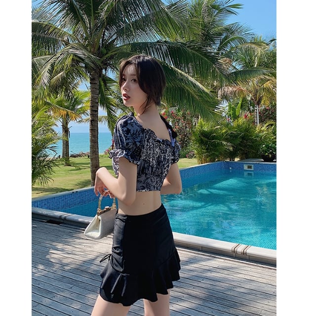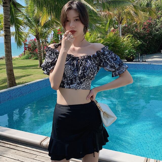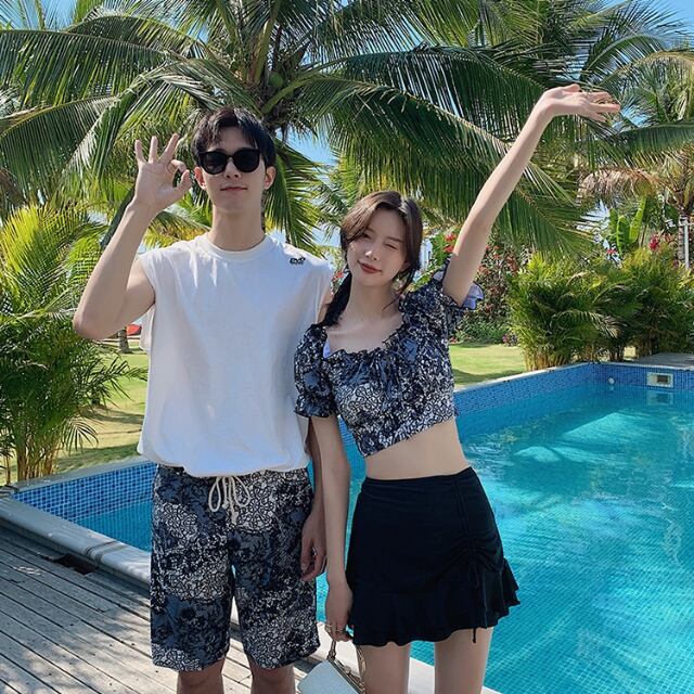 【予約販売】水着 カップル水着 3点セット ペアルック メンズ レディース ブラック スカート ビキニ セパレート水着 海水パンツ 海パン ペア水着 恋人 おそろい お揃い M/L/XL/2XL