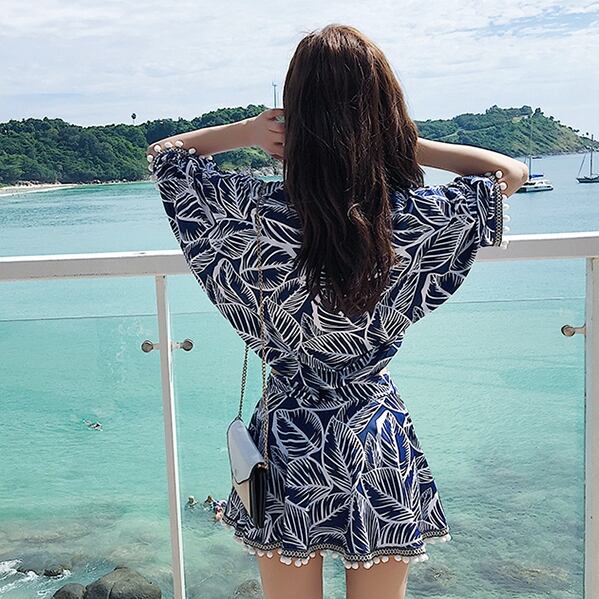 【予約販売】水着 カップル水着 3点セット ペアルック メンズ レディース ブルー スカート ポンポン 総柄 ビキニ セパレート水着 海水パンツ 海パン ペア水着 恋人 おそろい お揃い M/L/XL/2XL