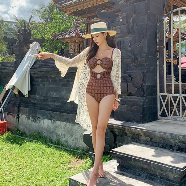 【予約販売】水着 レディース ワンピース 肌見せ セクシー リング ブラウン 変形デザイン 海 夏 ビーチ プール リゾート スイムウェア 可愛い こなれ感 お洒落 韓国 トレンド M/L/XL