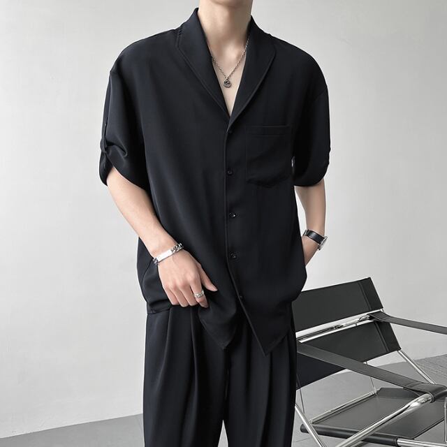 【予約販売】メンズ セットアップ 上下 パンツ 半袖シャツ 無地 薄手 グレー ベージュ ブラック カジュアル 春夏 韓国 トレンド こなれ感 M/L/XL/2XL