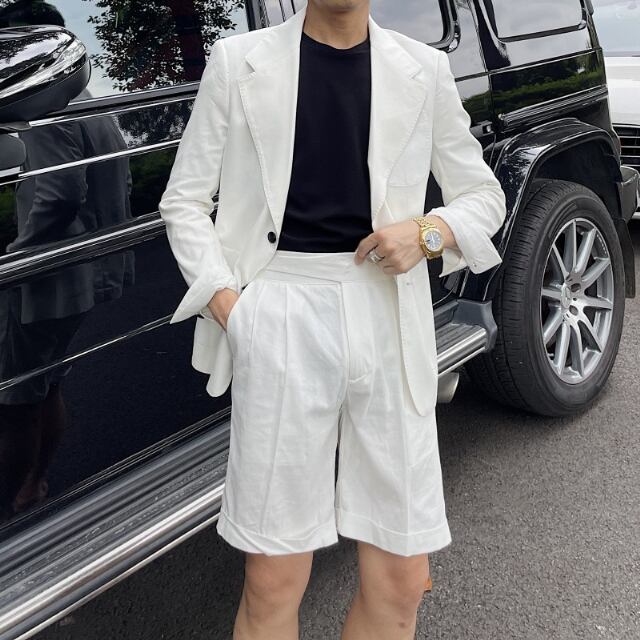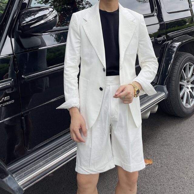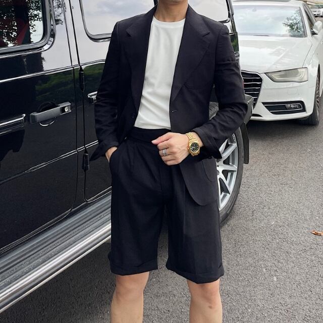 【予約販売】メンズ セットアップ スーツ 無地 長袖 ハーフパンツ カジュアル スリム スタイリッシュ シンプル 韓国 男前 ブラック/ホワイト/グリーン ジャケット セット セットアップ ビジネス 通勤 フォーマル パーティ 二次会 同窓会 結婚式 韓国 こなれ感 トレンド 春 夏 大きいサイズ M/L/XL/2XL/3XL