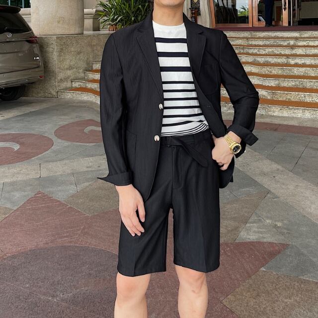 【予約販売】メンズ セットアップ スーツ 無地 長袖 ハーフパンツ カジュアル スリム スタイリッシュ シンプル 韓国 男前 グレー/ベージュ/ブラック ジャケット セット セットアップ ビジネス 通勤 フォーマル パーティ 二次会 同窓会 結婚式 韓国 こなれ感 トレンド 春 夏 大きいサイズ M/L/XL/2XL/3XL