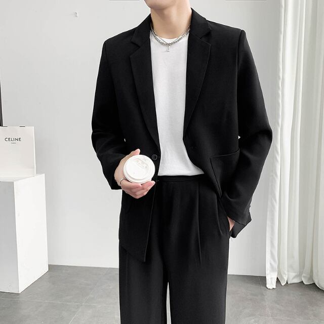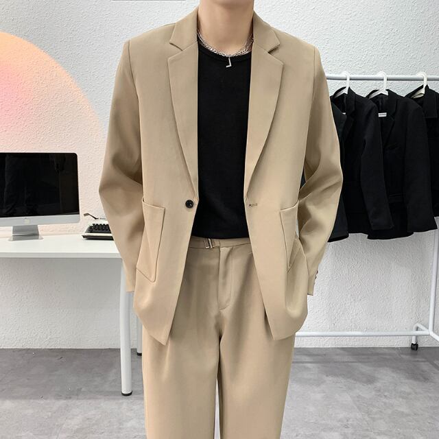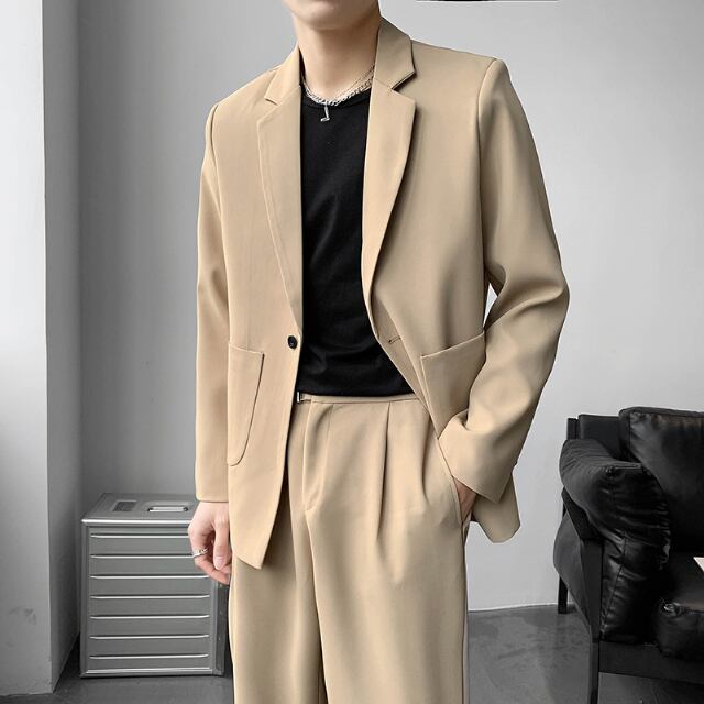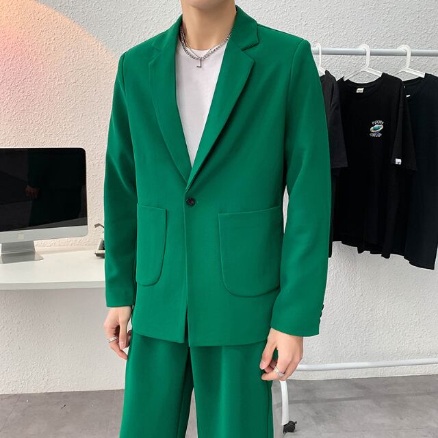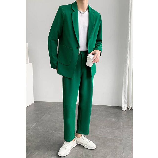 【予約販売】メンズ セットアップ スーツ 無地 長袖 カジュアル スタイリッシュ シンプル 韓国 男前 グリーン/ブラック/ベージュ ジャケット パンツ セット セットアップ ビジネス 通勤 フォーマル パーティ 二次会 同窓会 結婚式 韓国 こなれ感 トレンド 春 夏 大きいサイズ M/L/XL/2XL