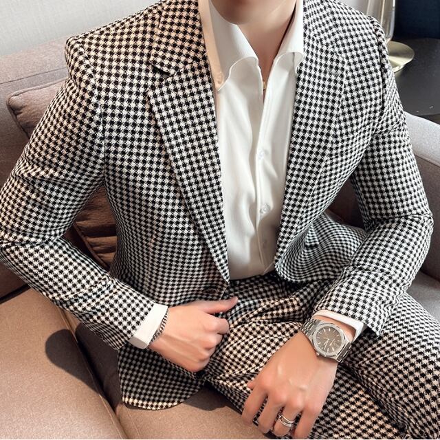 【予約販売】メンズ セットアップ スーツ チェック柄 シック スリム スタイリッシュ シンプル 韓国 男前 ベージュ/ブラック ジャケット パンツ セット セットアップ ビジネス 通勤 フォーマル パーティ 二次会 同窓会 結婚式 韓国 こなれ感 トレンド 春 夏 大きいサイズ M/L/XL/2XL/3XL