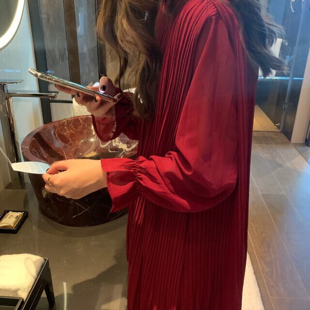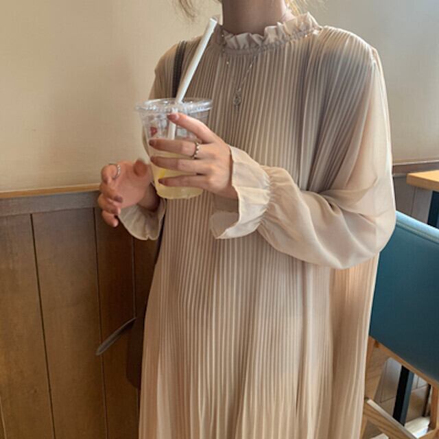 ワンピース レディース ロングワンピ ロング丈 プリーツ ボリュームスリーブ フリル おしゃれ かわいい 秋冬 パープル/ブラック/アプリコット