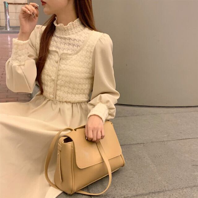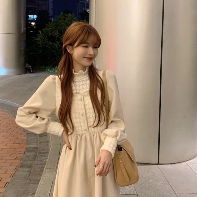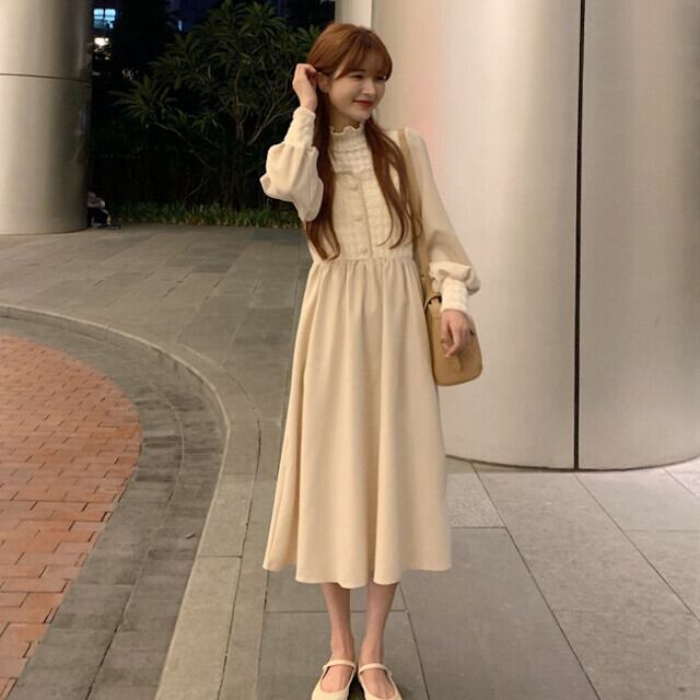 ワンピース レディース ひざ下丈 ミモレ丈 上品 パールボタン 詰襟 ボリュームスリーブ かわいい おしゃれ お呼ばれ パーティ デート アプリコット S/M/L