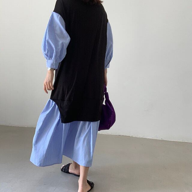 ワンピース レディース ロングワンピ マキシ丈 レイヤード風 重ね着風 ボリュームスリーブ 爽やか おしゃれ 大人かわいい カジュアル ホワイト/ブルー