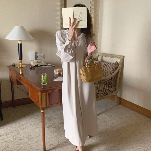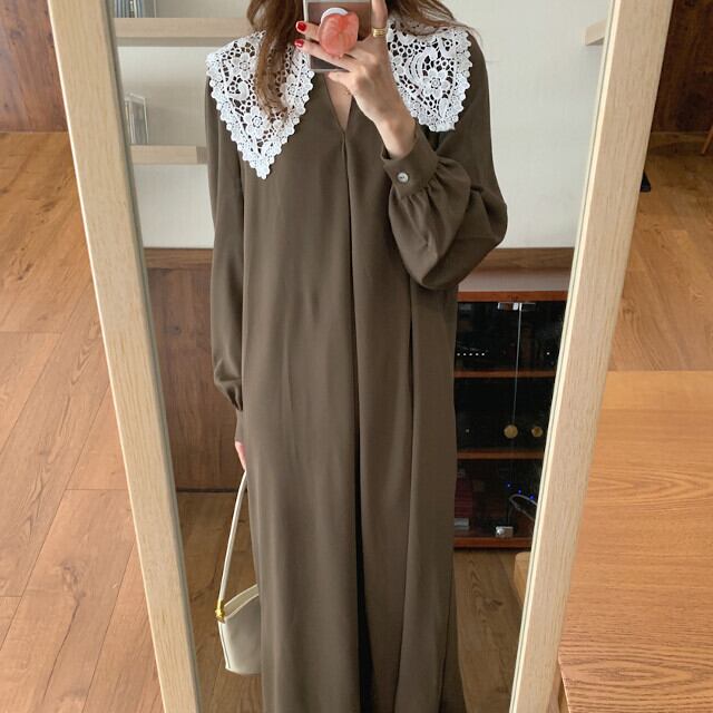 ワンピース レディース ロングワンピ ビッグカラー レース ボリュームスリーブ 大人かわいい おしゃれ 秋冬 ブラウン/ブラック/アプリコット