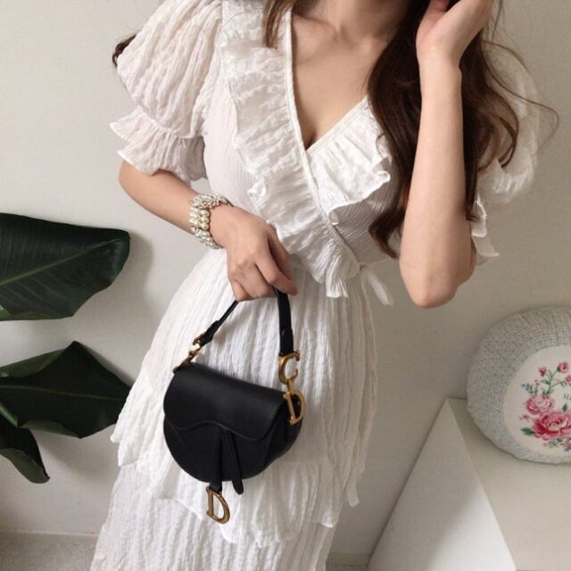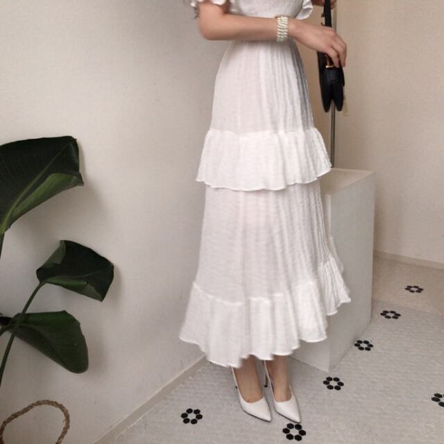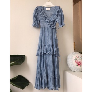 【予約販売】ワンピース レディース デニム フリル ワンピース シャーリング ロングドレス Vネック ホワイト ブルー 細見え お呼ばれ ドレス きれいめ ワンピ 大人可愛い エレガント おしゃれ こなれ感 韓国 S/M/L