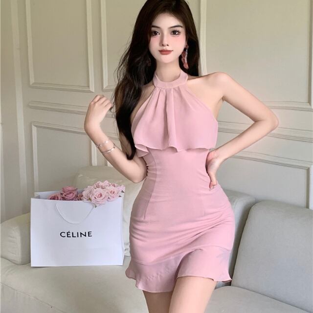 【予約販売】ワンピース レディース ホルターネック フリル タイト 背中見せ ミニワンピース 細見え ピンク お呼ばれ 結婚式 ドレス きれいめ ワンピ 大人可愛い エレガント おしゃれ こなれ感 韓国 S/M/L/XL