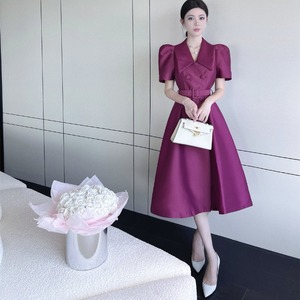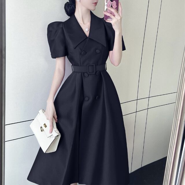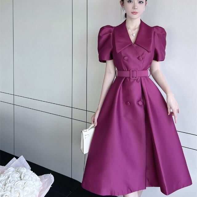 【予約販売】ワンピース レディース パフスリーブ 襟 ウエストマーク Aライン スリット 細見え ブラック パープル 黒 お呼ばれ 結婚式 ドレス きれいめ ワンピ 大人可愛い エレガント おしゃれ こなれ感 韓国 S/M/L